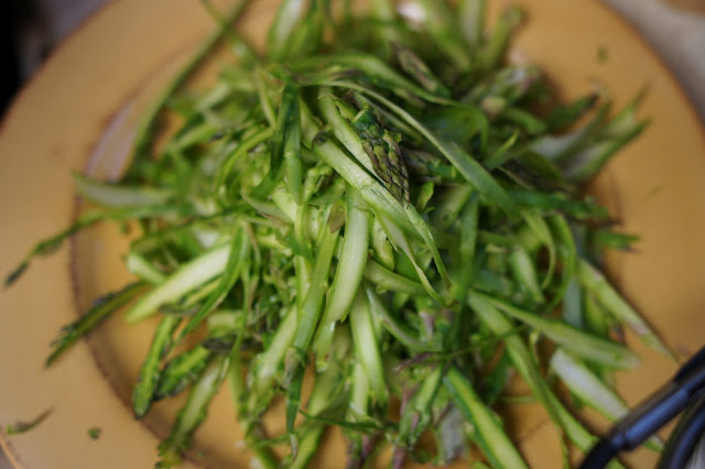 While those were sautéing, I started on my shaved asparagus pizza, also from Smitten Kitchen. Shaving asparagus with a potato peeler is actually a lot harder than it looks. It took the entire length of Sanne's shower for me to finish shaving a bunch of asparagus.